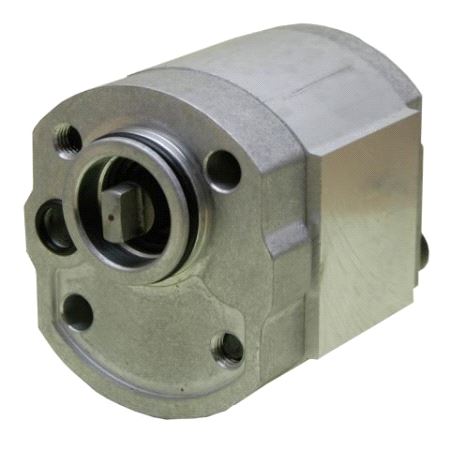 Tannhjulspumpe med trykkløp i frontflens og sugeport i baklokket.